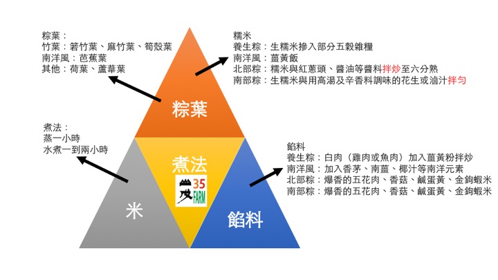 粽子的元素是包含了糯米、餡料、粽葉、煮法。透過這三個元素的組合變化,可以有無限的可能性。